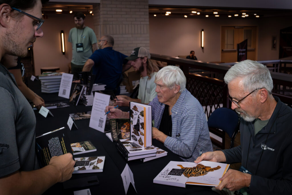 Continuing what is becoming a yearly tradition, the book signing event featured a diverse group of authors shaping the field of turtle conservation. Anthony Pierlioni signed copies of his newest titles, Turtle Preservation: The Ultimate Guide to Turtle Husbandry (co-authored with Russ Gurley) and The Great American Turtle Chase, both released in 2024. Other featured authors included Whit Gibbons and Jeffrey Lovich for the updated Turtles of the World; Whit Gibbons, Tracey Tuberville, and Kurt Buhlmann for Turtles of the Southeast; and Whit and Parker Gibbons for Aquatic and Terrestrial Vertebrates of the Black River Cypress Reserve.