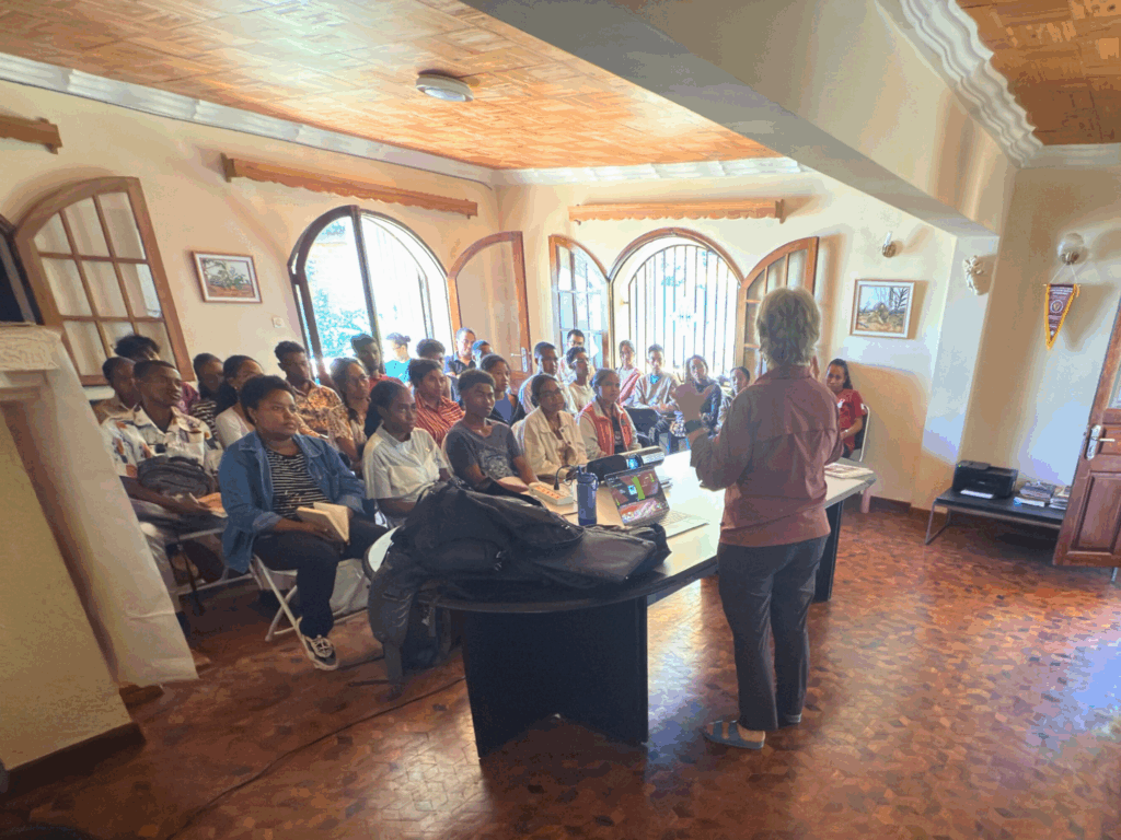 Dr. Bonnie Raphael gives a lecture to veterinary students from the University of Antananarivo. Photo by Sean Perry