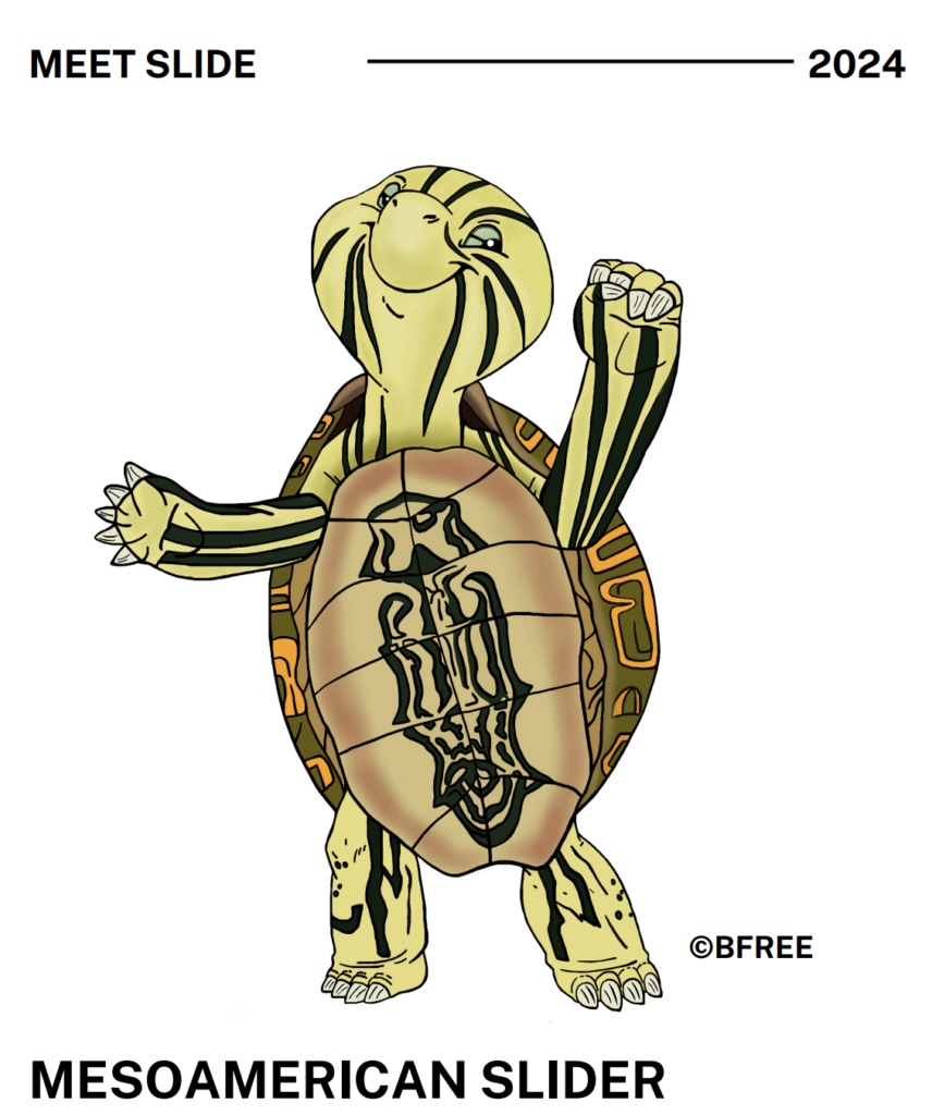 “Slide”, the Mesoamerican Slider, is one of the friends from the “Hicatee and Friends” campaign for Hicatee Awareness Month.