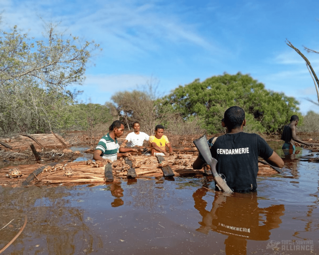 Staff, gendarmes, and community members use makeshift rafts created from the thatched roofs of the tortoises’ former enclosures to move them to safety.