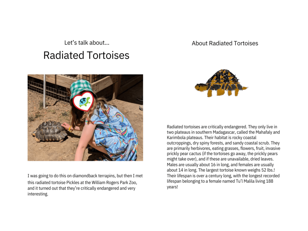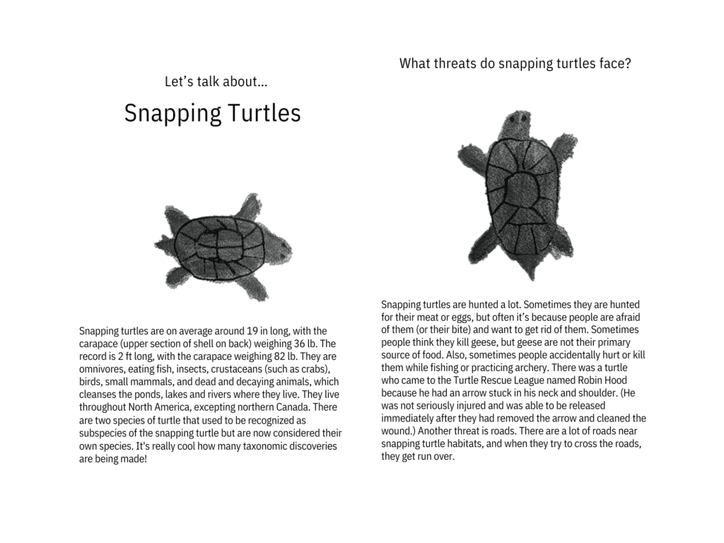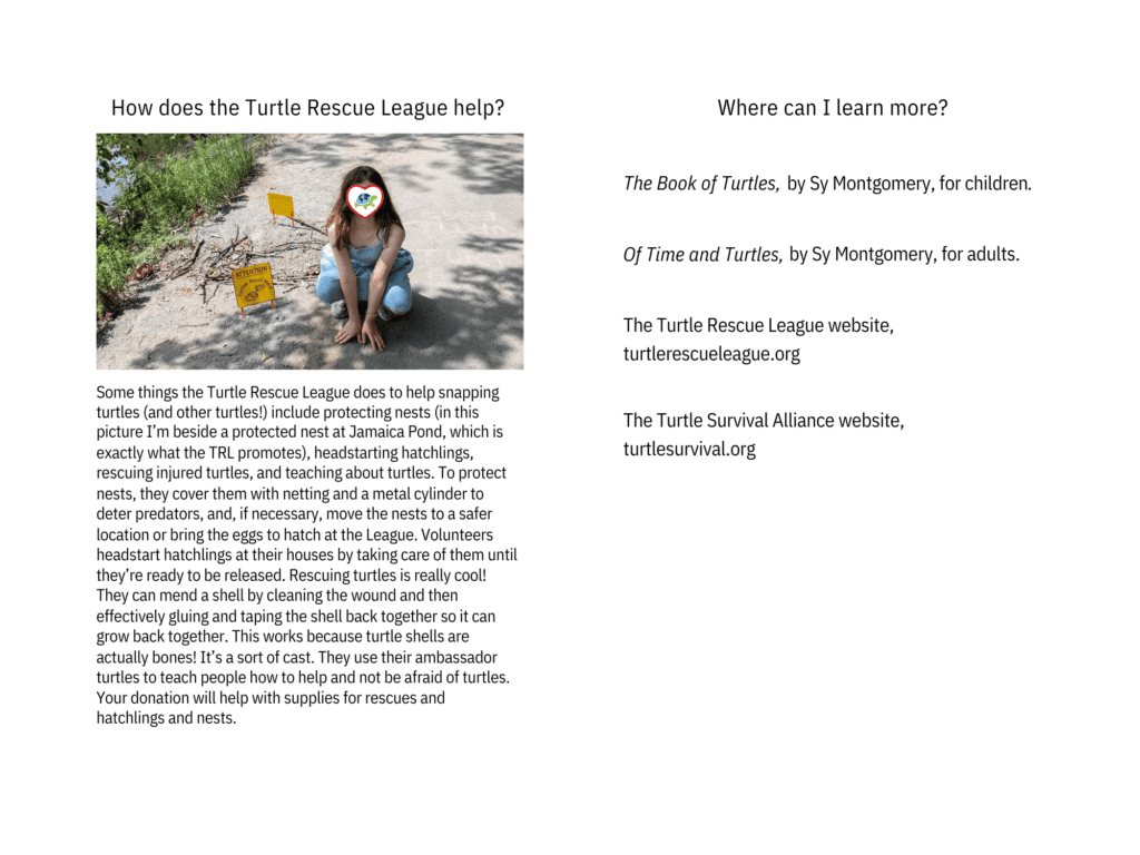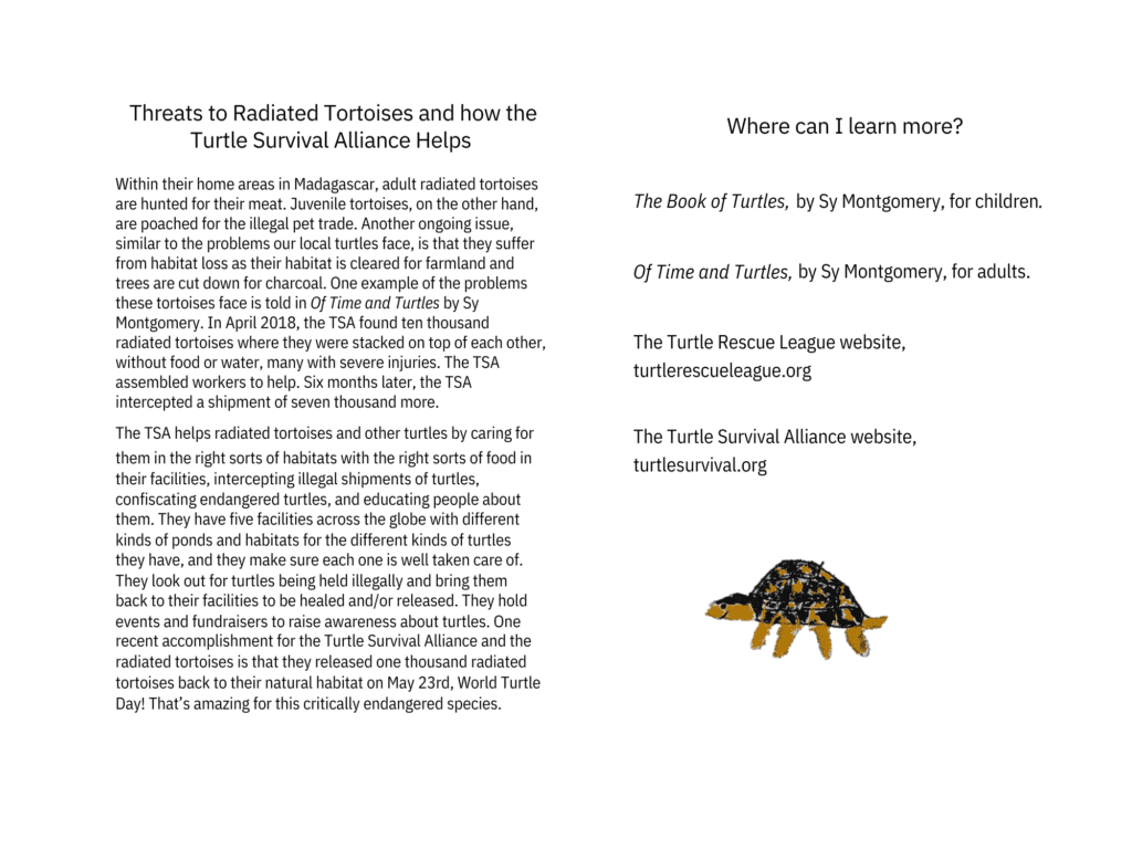 Inspired, Alice decided to run a fundraiser to support turtle conservation. She sold turtle-shaped cookies, and made leaflets about two species of turtles: the Common Snapping Turtle (Chelydra serpentina), and the Radiated Tortoise (Astrochelys radiata), both of which are turtle species that benefit from our conservation work. Her efforts raised $300, which she generously donated to Turtle Survival Alliance and the Turtle Rescue League.